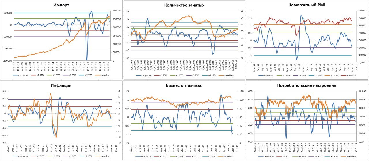 Как видим темпы изменения импорта, количества занятых остаются выше нулевой отметки и выглядят надежно.