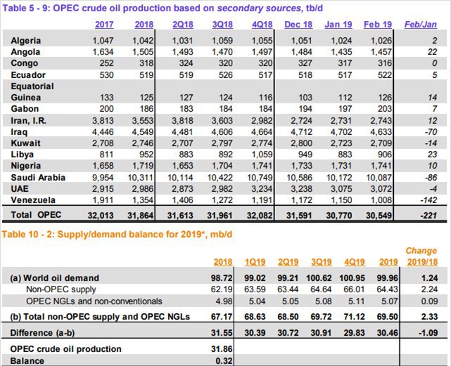 Для баланса спроса\предложения ОПЕК в первом квартале 2019 года должна добывать 30,39 мб\д. На февраль средняя в районе 30,65 мб\д.