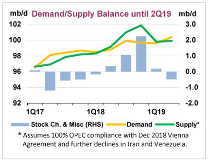 Со второго квартала начинается цикл дефицита нефти на 500 тб\д, правда при условии что тенденция по Ирану и Венесуэле бует и дальше ухудшаться, а ОПЕК выполнит на 100% соглашение. В отчете Минэнерго США второй квартал в профиците. Мнения экспертов разошлись.