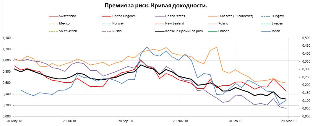 США по данному показателю догоняет Япония, на картинке голубая линия. Причем падение очень стремительное. Экономика страны ухудшается, это давит на Банк Японии который утюжит весь финрынок, а в условиях роста макроэкономического риска не только в стране, а и в мире, заставляет местные фининституты перекладываться в защиту - 10-летние облигации. Это и уплощает кривую. Вообще для японской йены наступают не лучшие времена, ибо ведущие центральные банки запускают новую волну QE, а ФРС, как минимум останавливает QT. В итоге это ведет к росту аппетита к риску, весь рынок йеновых активов останется за бортом.