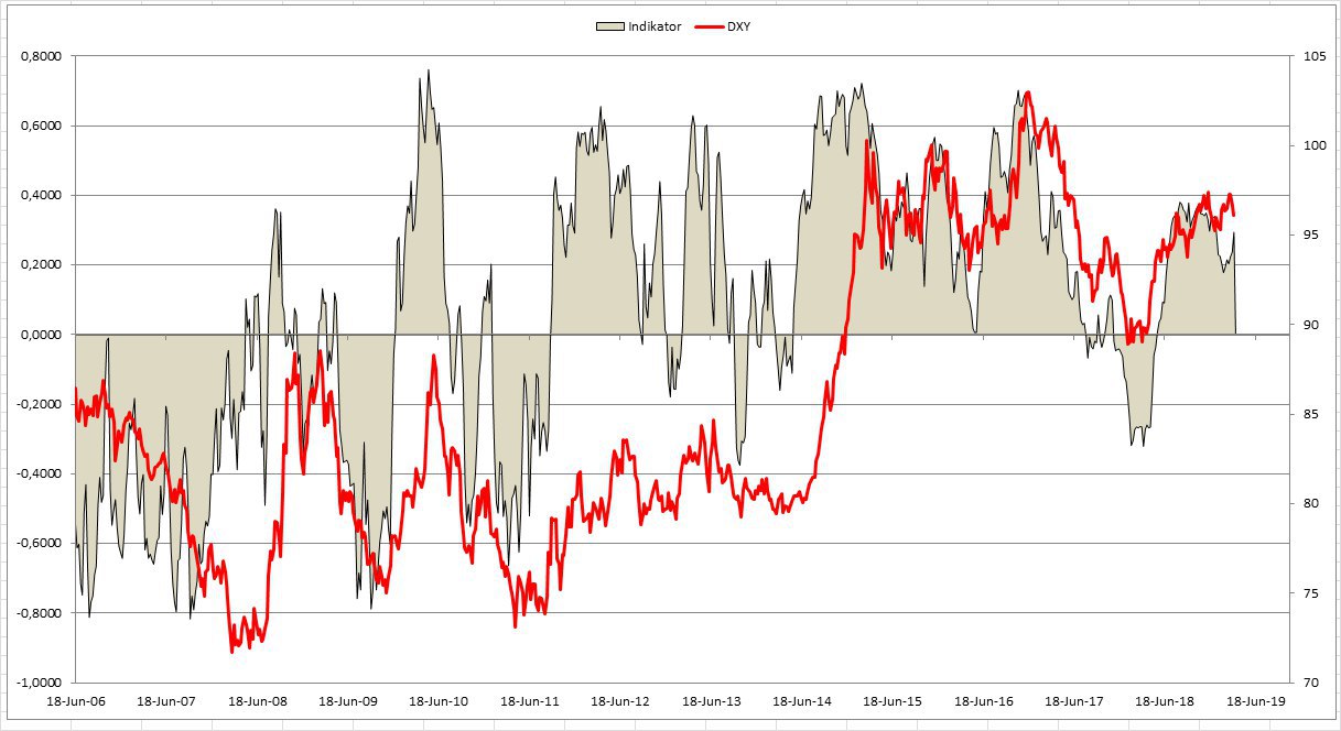 #валюты Хм, индикатор по индексу доллара начал расти (серая область), пока не понятно, это коррекция и начнется полномасштабное снижение курса доллара, как результат смягчения политики ФРС. Или же это последний рывок вверх курса доллара а-ля декабрь 2016 года, "против мнения рынка".