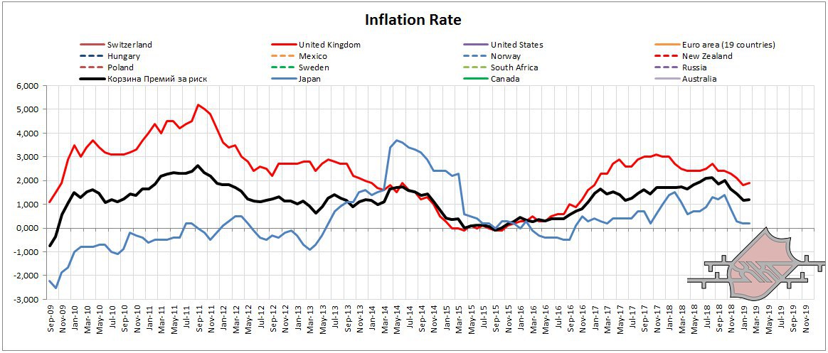 Ну да ладно. Судя по премиям за риск (спред между ставками денежного рынка и рынком капитала) проблемы есть. На картинке уже две экономики имеют перевернутые кривые доходности (инверсия) о которых трубят на всех углах Уолл-стрит и Сити. Эти страны США и Канада (зеленая и сиреневая линии соответственно).