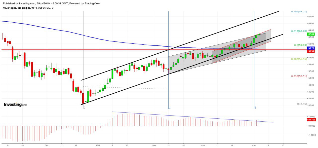 6) Поддержка подтянулась на 58,4 (красная горизонталь), там же сейчас и ЕМА-200.