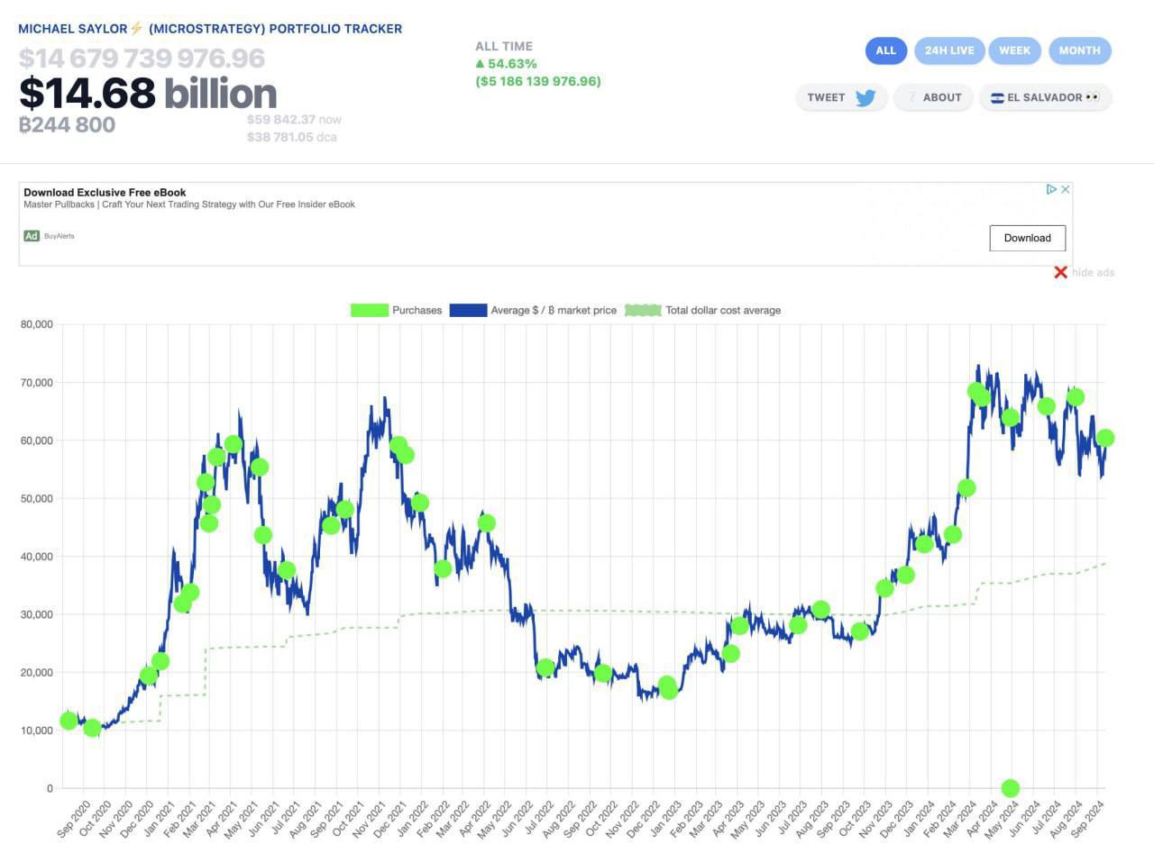 Одна из крупнейших компаний на крипторынке, MicroStrategy, владеет биткоинами на $14,6 млрд и уже имеет прибыль в $5,1 млрд. Однако вместо фиксации прибыли они продолжают докупать: за последний месяц увеличили свои запасы ещё на $1,2 млрд (отмечено зелёным на графике).