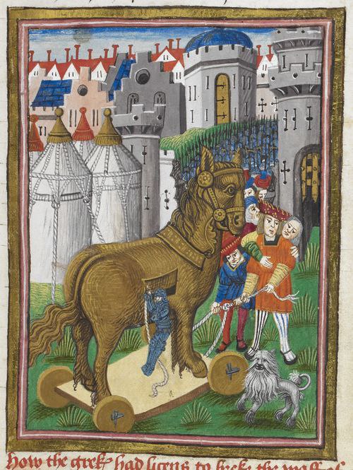 Немного прекрасного из английских средневековых рукописей: Троянский конь перед вратами Трои — Джон Лидгейт «Книга о Трое» (John Lydgate’s Troy Book), Англия, 1457 год. Конь явно несколько озадачен, зато пудель полон энтузиазма взять «крепкостенный Илион».