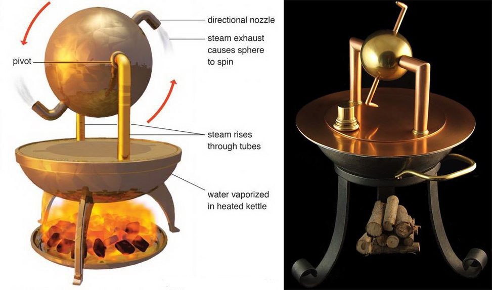 Но самое будоражащее воображение изобретение Герона — это, конечно, эолипил, то есть на самом деле полноценная паровая турбина, состоящая из подогреваемого котла с водой и шара с загнутыми выводными трубками, который вращается под действием реактивной тяги выходящего через трубки пара. Понятно что даже греки эпохи эллинизма отнеслись к этому изобретению без технократического энтузиазма, коим отмечена наша текущая современность.