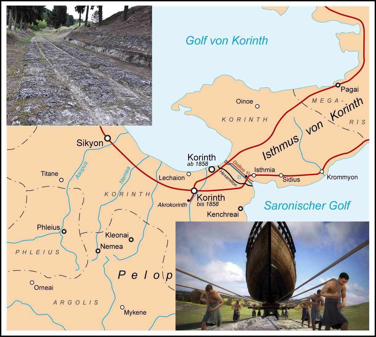 Плюс коринфяне не поленились и все 6 км этого волока со временем неплохо оборудовали: вымостили дорогу шириной 3-4 м каменными плитами с глубокими желобами, в которые помещали деревянные полозья, смазанные жиром, и тащили суда (подробно вот в этом видео можно посмотреть).