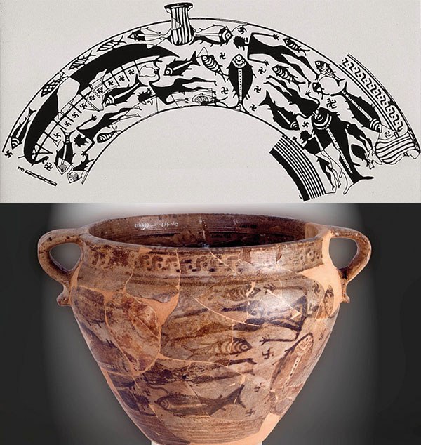 Далее, было бы очень странно предполагать, что «Одиссея» — единственный эпический сюжет о мореплавании, кочевавший по просторам Древней Греции. В тех же Питекуссах найден, например, совершенно прекрасный кратер с «рассказом» о затонувшем корабле и плывущих в волнах с рыбами несчастных моряках (см. картинку ниже). Там на нем еще свастики сплошные, то есть сакральные солярные (возможно охранительные) знаки, так что речь, скорее всего, не о простой зарисовке о трудной жизни эпойков. Тем более что на соседнем микроостровке Vivara найдено вполне себе микенское поселение, не дворец, конечно, но торговый перевалочный пункт точно. Так что шанс на сохранения информации об этих землях в нарративной традиции очень велик, а потом и периплы стали записывать.