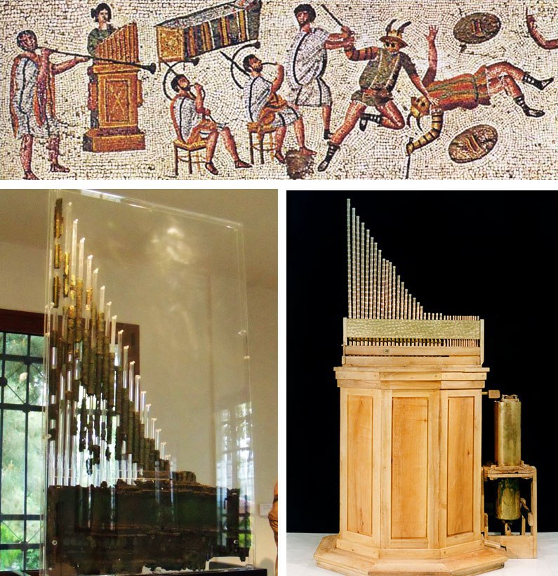 Давно у нас не было ничего музыкального, просто про авлос я уже рассказывала, так что знакомьтесь c более поздней и усложнённой версией сего духового инструмента — гидравлос. По сути это был вполне себе водяной орган, изобретателем которого в античной литературе назывался Ктесибий, который, как и недавно вспоминаемый нами Герон со своим эолипилом, жил и придумывал всякие классные штуки в Александрии, но лет на 200 раньше, в 3 веке до н.э. Правда письменных свидетельств его трудов не сохранилось, но ссылки на его первенство есть у Афинея, Витрувия и Плиния Старшего. Не буду тут долго расписывать как он был устроен, лучше в любом случае один раз увидеть и услышать, например, вот здесь. Гидравлос насчитывал 3—4 регистра, в каждом из которых было от 7 до 19 труб диатонической настройки, то есть разные тона производились с помощью трубок разного размера.