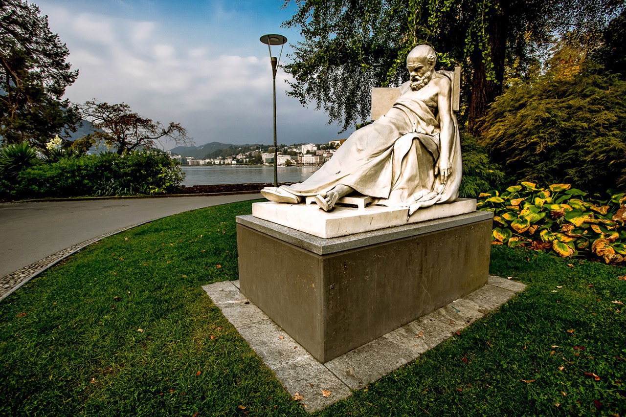 У меня же к занятиям презентаций меньше чем на сто слайдов не выходит, вот и вчера ночью искала я приличную фотографию скульптуры Антокольского «Умирающий Сократ», ту самую, что удостоилась золотой медали на Всемирной выставке в Париже в 1878 году. У нас в Русском Музее, что удивительно, копия, а оригинал, как вы думаете, где? Правильно, в стране с последней теплящейся прямой демократией в Европе (или в мире?) — в Швейцарии, историей и литературой которой я пять студенческих лет упорно занималась (у всех свои причуды, ага). Поучительную картину смерти принявшего яд философа можно сегодня увидеть в парке Ciani на берегу Луганского озера, то есть собственно в Лугано, в италоговорящем кантоне Тичино.