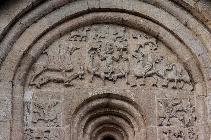 А теперь представьте, я только вот вчера узнала, что довольно заметная такая сцена с грифонами на фасаде это, не поверите, оно и есть — «Вознесение Александра Македонского на небеса»! Оказывается, этот сюжет взят из «Александрии» Псевдо-Каллисфена и был весьма популярен в средние века. При этом манера вознесения у Александра совершенно читерская: он сидит в корзине, к которой привязаны грифоны, и держит руках в качестве приманки маленьких львят (ну все же знают, что грифоны прямо сами не свои до львят, угу). Грифоны тянутся к ним и поднимают Александра наверх, возносят то есть. Еще над всей компанией мечутся две удивленные райские птицы и какие-то звери, но их функция в композиции мне не ясна. В общем, будете во Владимире — не проходите мимо, приглядитесь к южному фасаду Дмитровского собора.