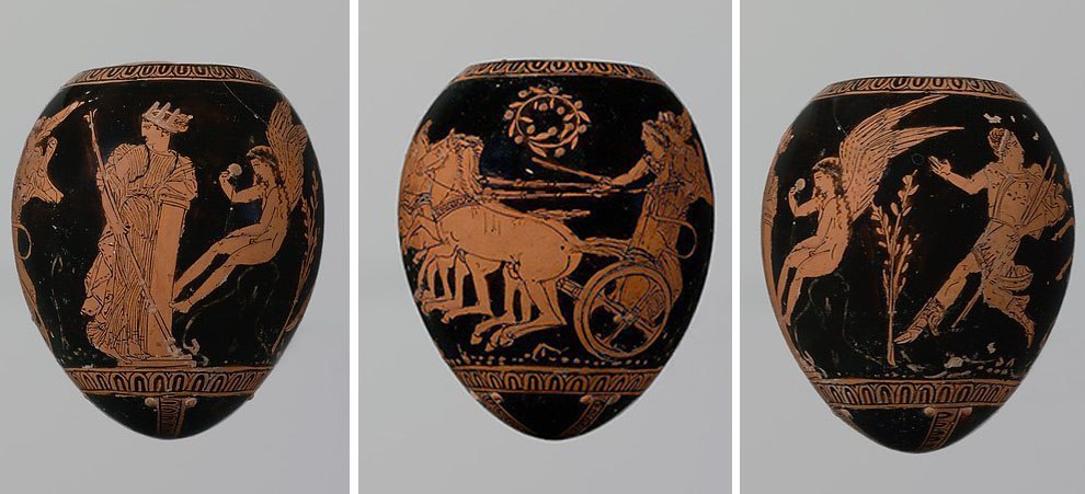 В греческой мифологии мировое яйцо появляется у орфиков. Это те, которые про реинкарнацию, помните? Из него рождается Фанет, мужеженское божество-демиург, называемый также «двусущим», «двуприродным». Еще, как вы помните, из яйца по одной из версий родилась Елена Прекрасная, поэтому, например, на этом имитирующем форму яйца аттическом сосуде 420–410 гг. до н.э. изображена сцена побега спартанской царицы с Парисом в Трою.
