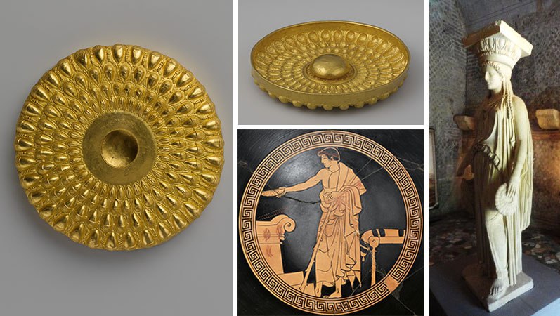 В качестве орнамента здесь использованы желуди и пчелы. Про символику пчел и меда я когда-то давно уже довольно много говорила, а вот желуди можно было увидеть на таких же фиалах в руках у кариатид акропольского Эрехтейона. Откуда нам это известно? Как всегда благодаря римским копиям, в данном случае с виллы Адриана в Тиволи (на картинке справа).