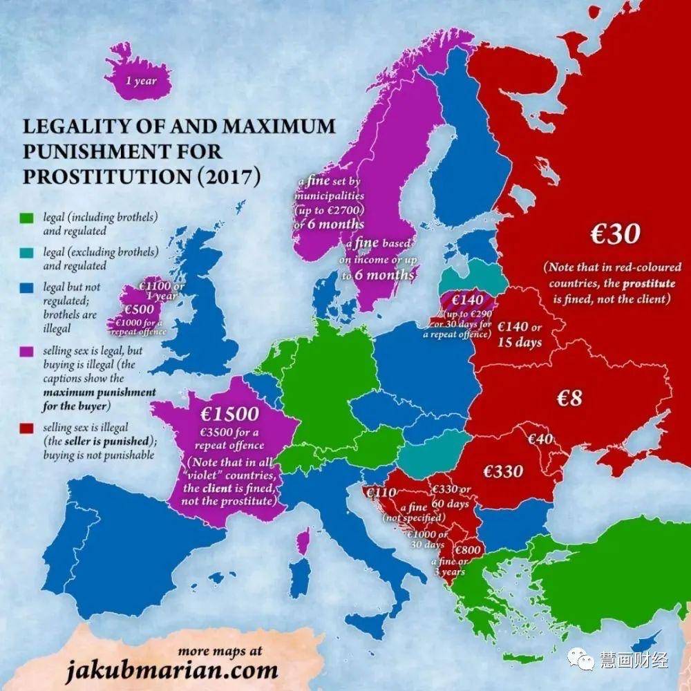 紫色 - 罚嫖不罚娼,买春有罪,卖春无罪,即「北欧模式」;包括瑞典、挪威、冰岛、爱尔兰、北爱尔兰、法国。