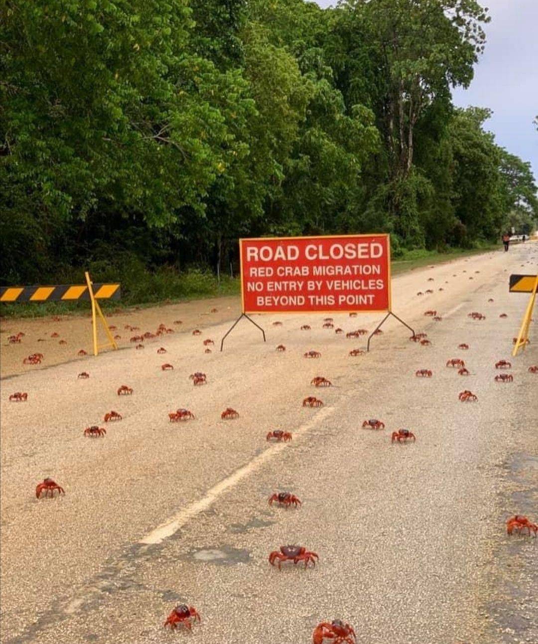 刚才看新闻,澳大利亚红螃蟹从树林群体迁移到海里,所以Christmas Island上的部分道路关闭了不让车行,螃蟹们可以好好搬家。好有意思,保护小动物让个路什么的,确实很可爱的。