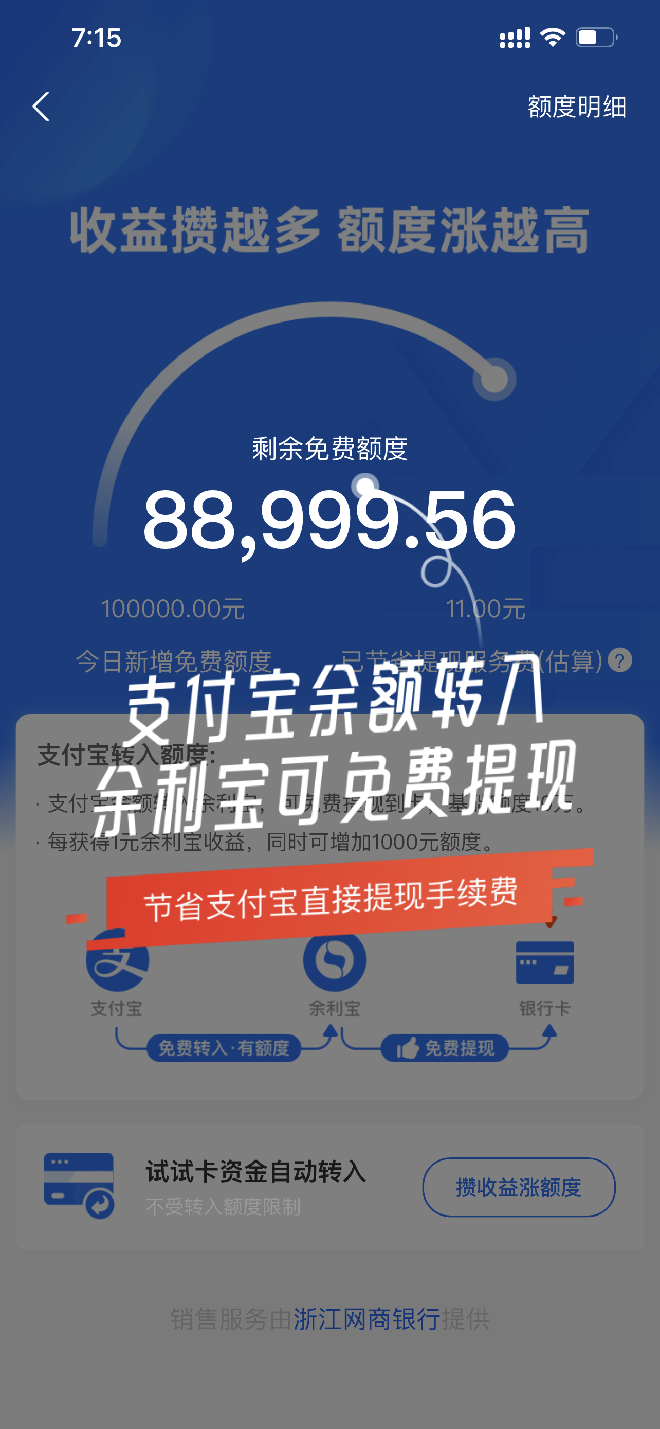 支付宝搜索“余利宝”,把钱转进去以后提现,或者直接还信用卡,不需要手续费。基础额度10万。