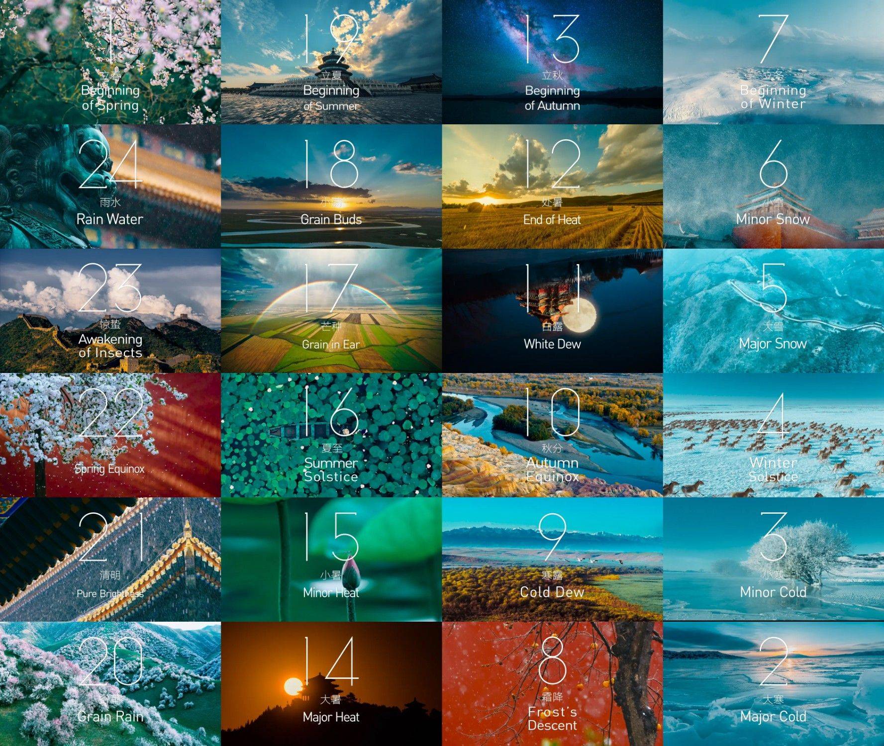 4x6个节气,四季的第1位都是Beginning“立”,第4位都是中点:春分秋分Equinox,夏至冬至Solstice。