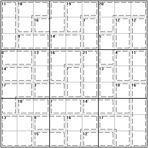 在基本数独的规则之上,还需要虚线框中的数字之和等于指定数字。(如图例)