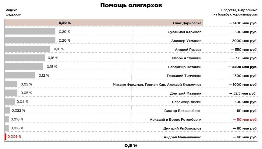 К нашему рейтингу мы добавили «индекс щедрости»: он показывает, какой процент от своего состояния потратил на борьбу с эпидемией тот или иной бизнесмен. Оказалось, что самым щедрым можно назвать далеко не самого богатого Олега Дерипаску: он подарил городам Сибири, Урала и Кубани почти 1 % своего изрядно сократившегося состояния.