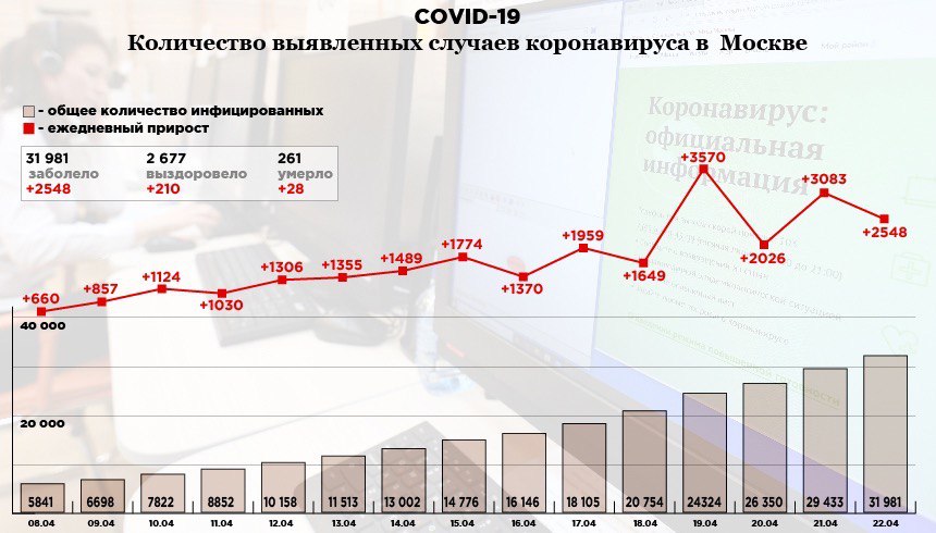 🇷🇺 В России, по официальным данным на утро 21 апреля, коронавирус выявили у 57 999 человек. Больше всего заразившихся в Москве (31 981) и Московской области (6 590). За все время от заболевания успешно излечились 4 420 человек, умерли — 513.