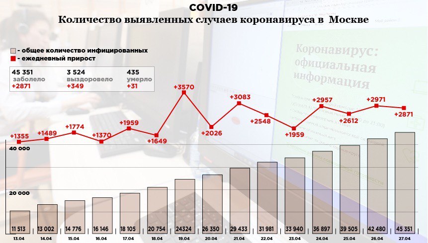 🇷🇺 В России, по официальным данным на 27 апреля, коронавирус выявили у 87 147 человек. Больше всего заразившихся в Москве (45 351) и Московской области (9 708). За все время от заболевания успешно излечились 7 346 человек, умерли — 794.