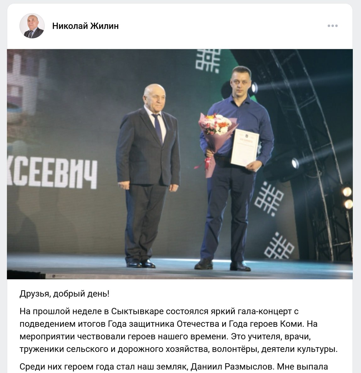 В Удорском районе разгорелось недоумение вокруг публичного жеста со стороны пока ещё главы муниципалитета Николая Жилина. На гала-концерте в Сыктывкаре, посвящённом итогам Года защитника Отечества и Года героев Коми, он вручил награду «герою года» своему земляку — индивидуальному предпринимателю Даниилу Размыслову.