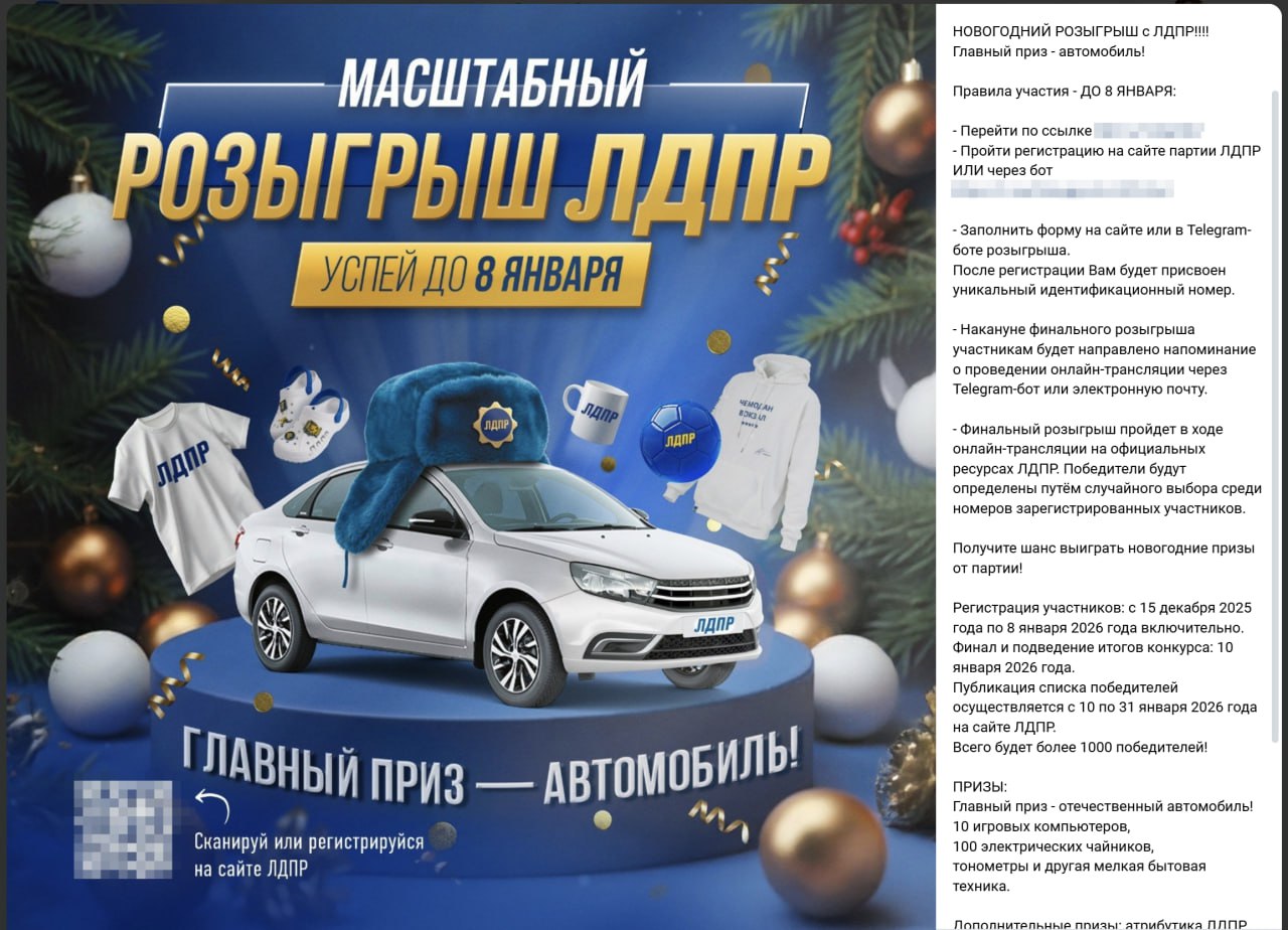 Партия запустила новогодний розыгрыш с главным призом в виде отечественного автомобиля. Для участия нужно зарегистрироваться на сайте или через Telegram-бот, получить индивидуальный номер и дождаться финального онлайн-розыгрыша. Обещают более тысячи победителей, а итоги подведут уже в январе.