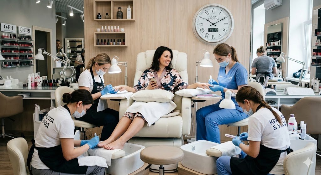 Для педикюра предусмотрены более длительные процедуры. Классический педикюр может занимать от 60 до 90 минут, аппаратный и препаратный — около 60–80 минут.