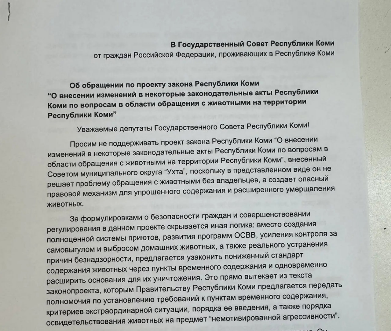 В тексте обращения говорится, что предлагаемый законопроект, по мнению авторов, не решает проблему бездомных животных, а может привести к упрощению процедуры их умерщвления. Также жители указывают на необходимость развития системы приютов, программ стерилизации и контроля за содержанием домашних животных.