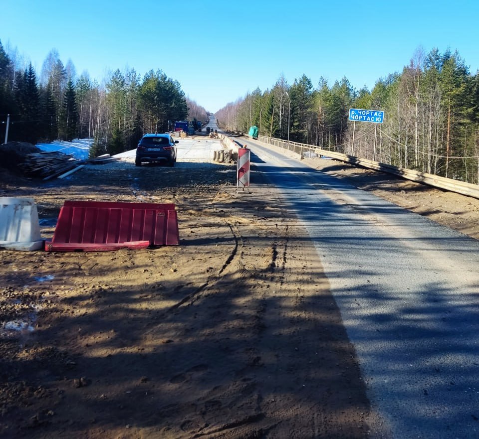 В Республике Коми продолжаются работы по обновлению мостовой инфраструктуры. В Корткеросском районе ведётся ремонт моста через реку Чортас — подрядчик работает на правой половине сооружения.
