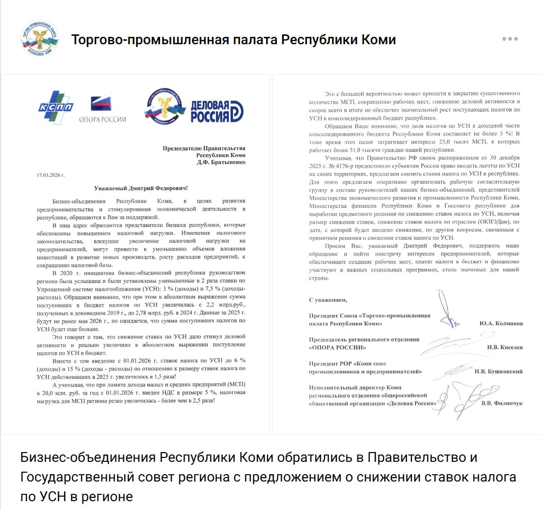 Соответствующие письма направлены председателю правительства Коми Дмитрию Братыненко и председателю Государственного совета Александру Макаренко. Под обращением подписались Торгово-промышленная палата республики, Коми союз промышленников и предпринимателей, а также региональные отделения «Опоры России» и «Деловой России».