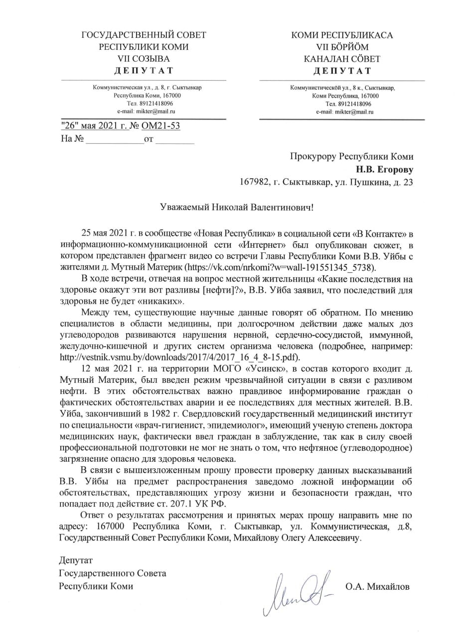 Главный коммунист Коми Олег Михайлов направил запрос в прокуратуру Республики в связи с заявлением Владимира Уйбы на встрече с жителями Мутного Материка о том, что нефтяное загрязнение не опасно для здоровья человека.