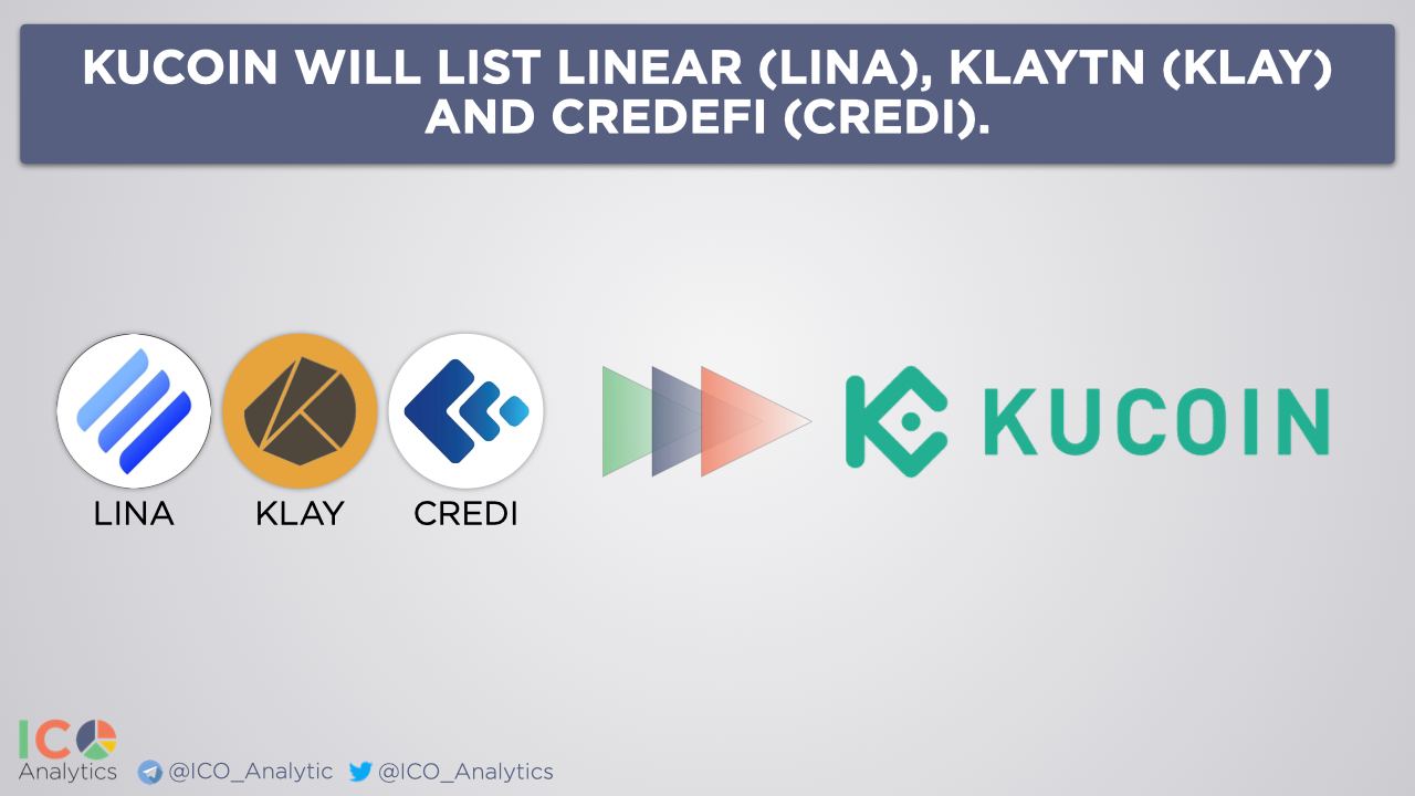 KuCoin will list Linear (LINA), Klaytn (KLAY) and Credefi (CREDI). LINA trading will go live at 9:00 AM (UTC) on Dec 8, KLAY will be available for trading from 10:00 AM (UTC) on Dec 8. CREDI trading will go live at 10:00 AM (UTC) on Dec 9.