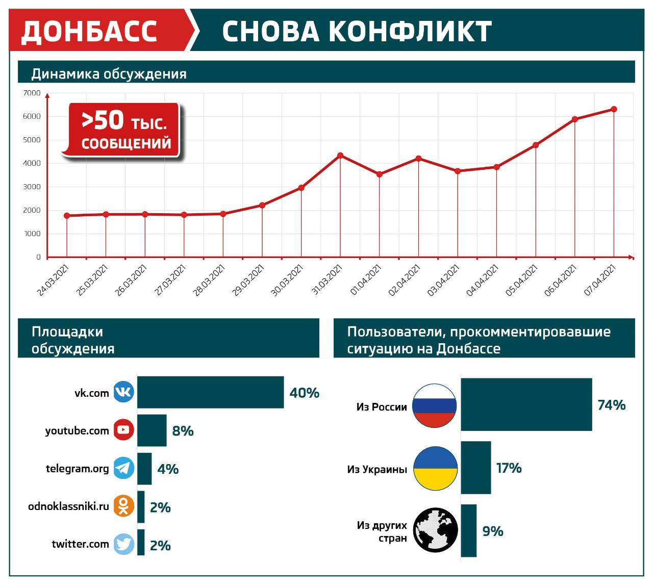 СМИ называют эскалацию самой серьезной с июля прошлого года. Пользователи социальных сетей активно реагируют на тревожные новости. В среднем на одну публикацию приходится более 100 лайков и 10 комментариев. Подавляющее число (около 90%) записей имеет негативный характер и содержит обвинения в адрес той или иной стороны конфликта. Доля позитивных публикаций составляет менее 1%.