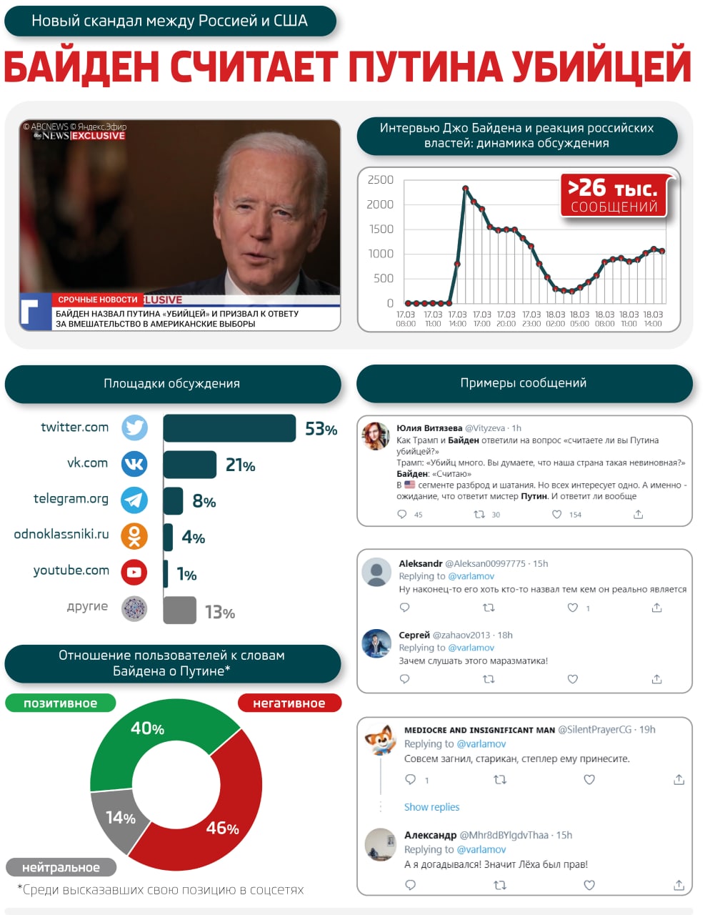 Российские СМИ и пользователи соцсетей активно обсуждают слова Байдена: за день было опубликовано более 16 тысяч сообщений. Около половины пришлось на Twitter, с которым активно борются российские власти.
