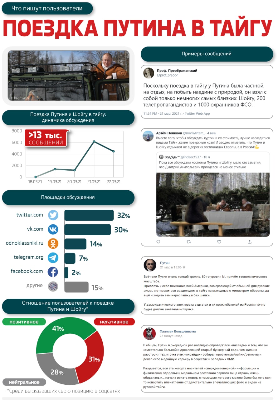 При этом около 40% пользователей позитивно высказались о выходных президента. Часть аудитории одобрила выбор тайги в качестве туристического направления, другим пользователям понравился "брутальный" образ Путина и аскетичный быт в поездке. Многие провели параллели между лидерами России и США, отметив, что Байден не может сравниться с российским президентом по уровню активности и состоянию здоровья.