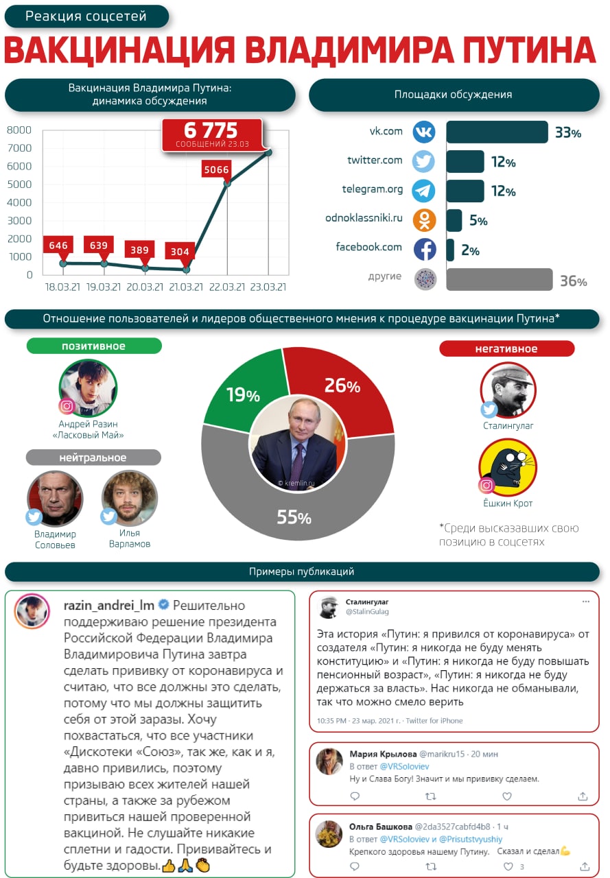 Владимир Путин 23 марта сделал прививку от коронавируса. О своем намерении он объявил накануне, что вызвало ажиотаж в СМИ и соцсетях: за день почти 4 тысячи источников опубликовали более 5 тысяч сообщений, а непосредственно в день вакцинации число публикаций достигло 6,7 тысячи.