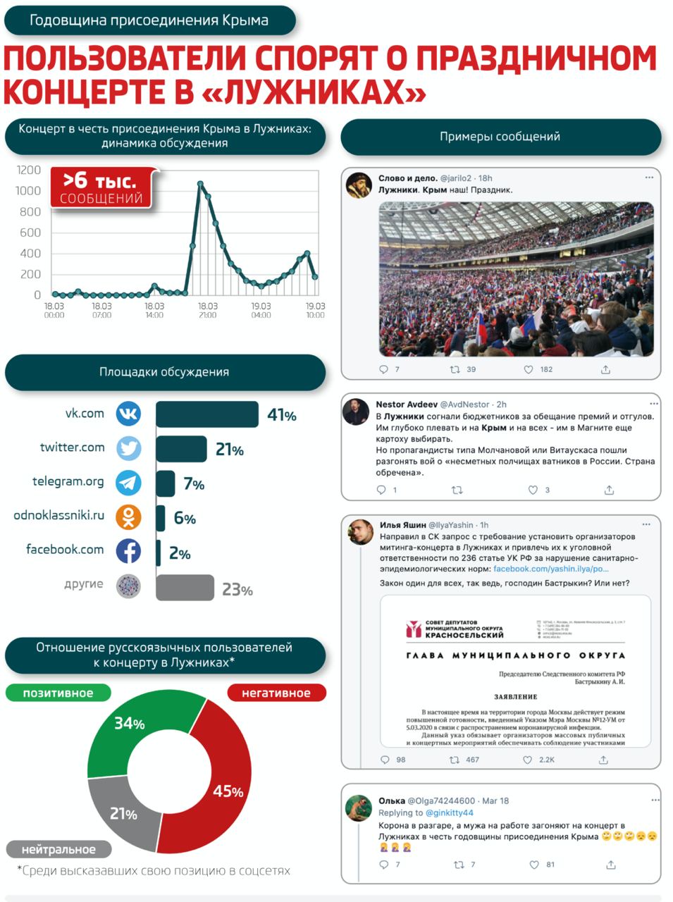 Концерт активно освещали СМИ и обсуждали пользователи соцсетей. За день было опубликовано почти 5 тысяч сообщений. Публикации СМИ имели в основном нейтральный или позитивный характер, а вот тональность постов и комментариев пользователей отличалась большим разнообразием. Часть аудитории выразила радость по поводу годовщины, концерта и выступления на нем Путина.