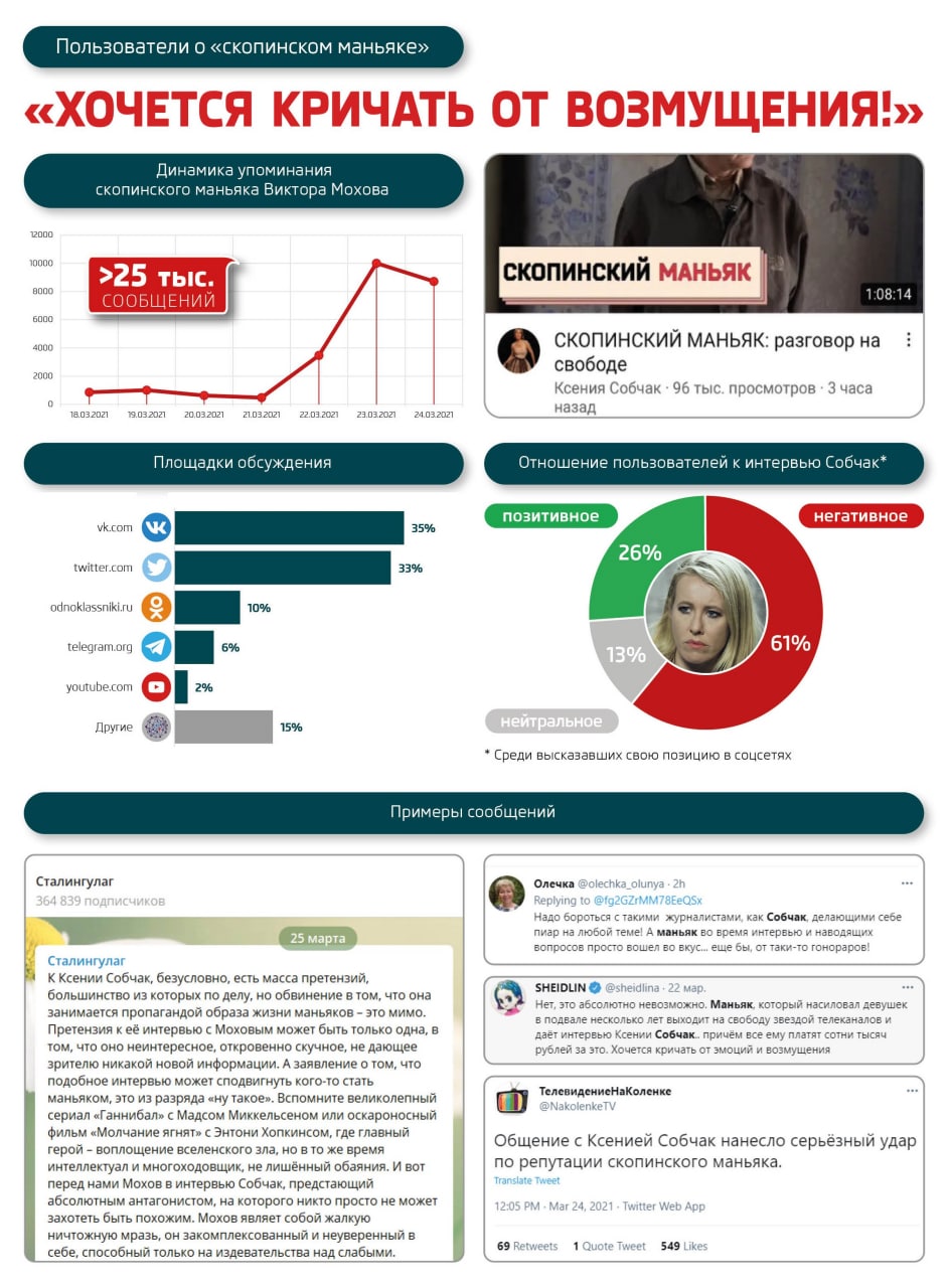 Большинство сообщений имеет негативную окраску, причем критика связана как с личностью и преступлениями самого Мохова, так и с решением Собчак взять у него интервью. Многих пользователей возмутило, что таким образом преступник получил не только возможность "попиариться", но и заработать.