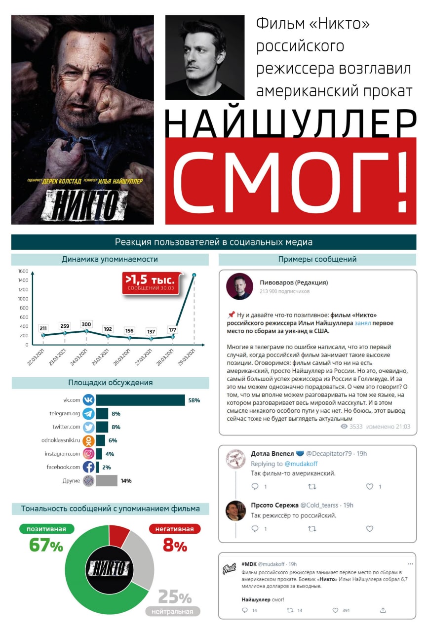 Внимание СМИ и пользователей соцсетей привлекли сборы американского фильма "Никто" российского режиссера Ильи Найшуллера. За выходные в США картина собрала 6,7 млн долларов и возглавила прокат. Такого успеха фильмы российских режиссеров в Штатах еще не добивались. В 2008 году к нему приблизился "Особо опасен" Тимура Бекмамбетова, но уступил в конкуренции с мультфильмом "ВАЛЛ·И".