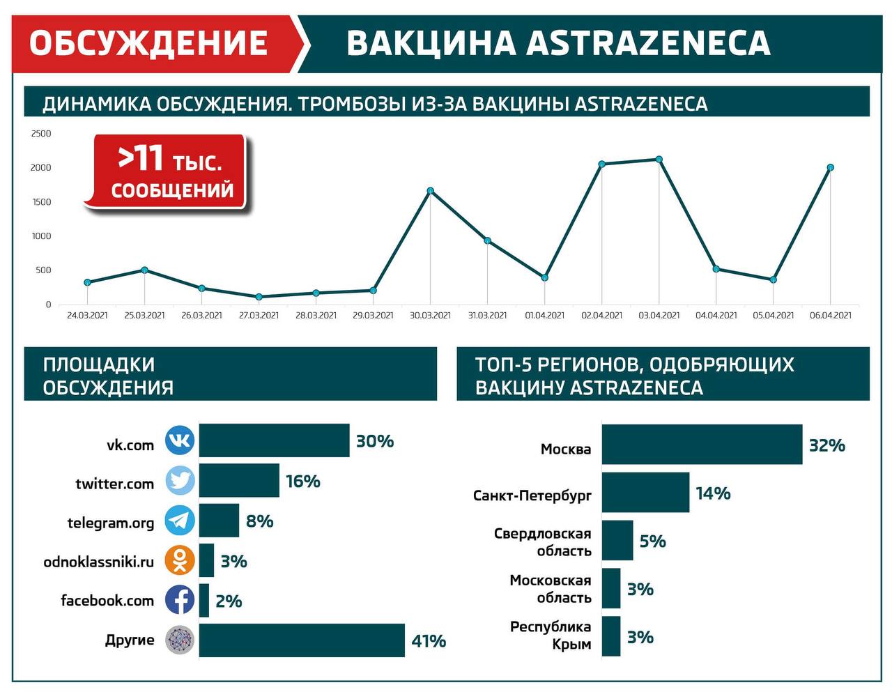 У русскоязычных СМИ и пользователей соцсетей новость о взаимосвязи тромбоза с вакцинацией вызвала большой интерес. Во вторник на эту тему было сделано более 2 тысяч записей, что по активности обсуждения сопоставимо с сообщением о прекращении производства AstraZeneca в США. Всего же за две недели о побочном эффекте вакцины написано 11 640 сообщений. В совокупности они собрали примерно 91 тысячу лайков и 8,7 тысячи комментариев. По уровню интереса это превзошло даже резонансное ДТП с участием (https://t.me/kribrumSM/113) скандального блогера Эдварда Била.