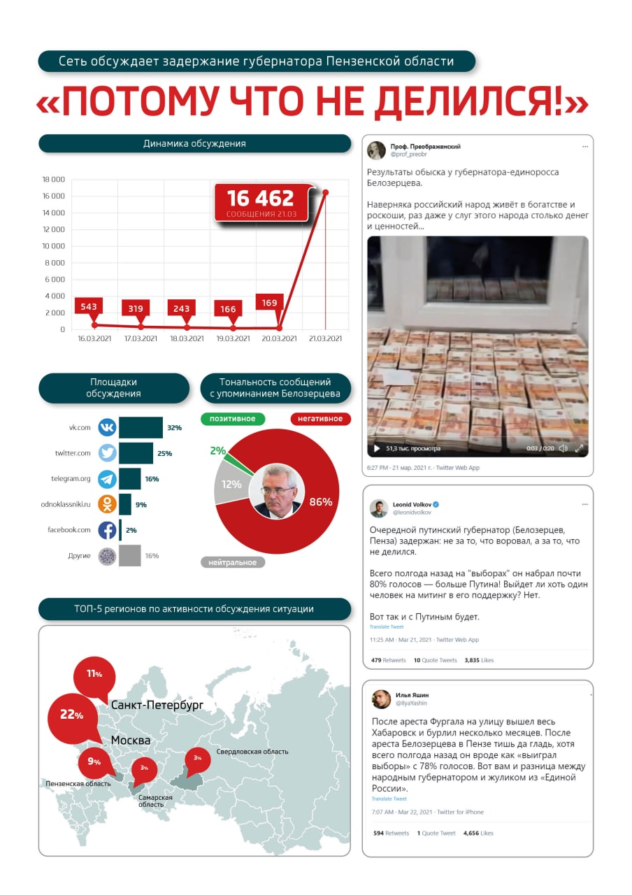 Последние события вызвали всплеск негатива со стороны аудитории соцсетей. Более 85% сообщений 21 марта содержали критику в адрес губернатора. При этом все происходящее с Белозерцевым критики расценили по-разному.