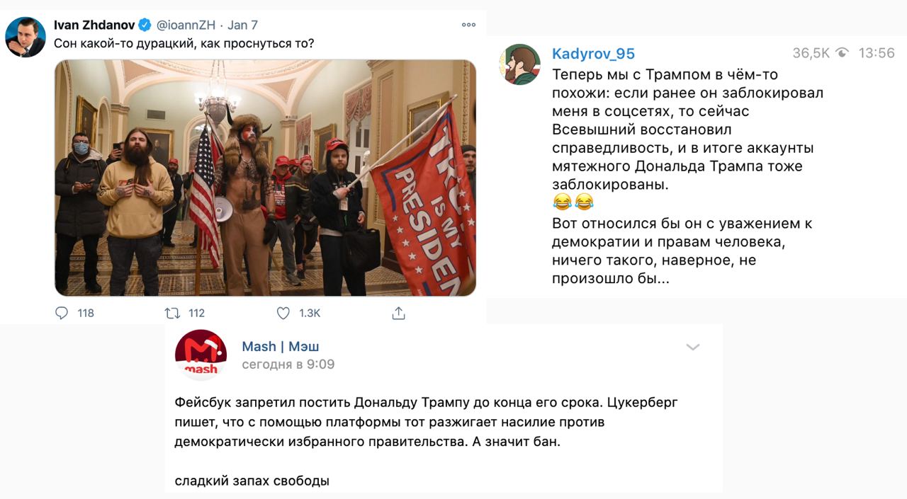 Пользователи активно обсуждали фото и видео "штурма" Конгресса. Поводом для множества шуток стал костюм викинга, в который был одет один из протестующих. При этом большая часть сообщений опубликована прямо или косвенно в поддержку Трампа и его сторонников. Так, многие осудили блокировку аккаунтов действующего президента в Twitter и Facebook, обвинив компании в нарушении свободы слова. Такую политику соцсетей прокомментировал и глава Чечни Рамзан Кадыров, сравнив себя с Трампом.
