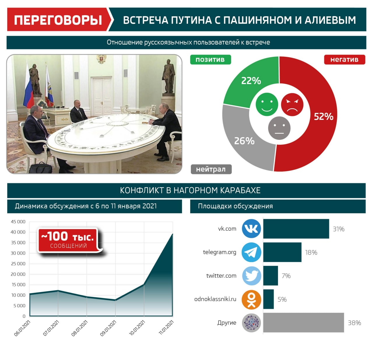 Несмотря на деэскалацию, конфликт в Нагорном Карабахе продолжает вызывать острую реакцию пользователей социальных медиа. Сохраняется высокий градус напряженности между сторонниками Армении и Азербайджана, что отразилось и на дискуссии вокруг встречи. Многие пользователи публикуют оскорбительные высказывания в адрес "противника", а также призывы к продолжению насилия.