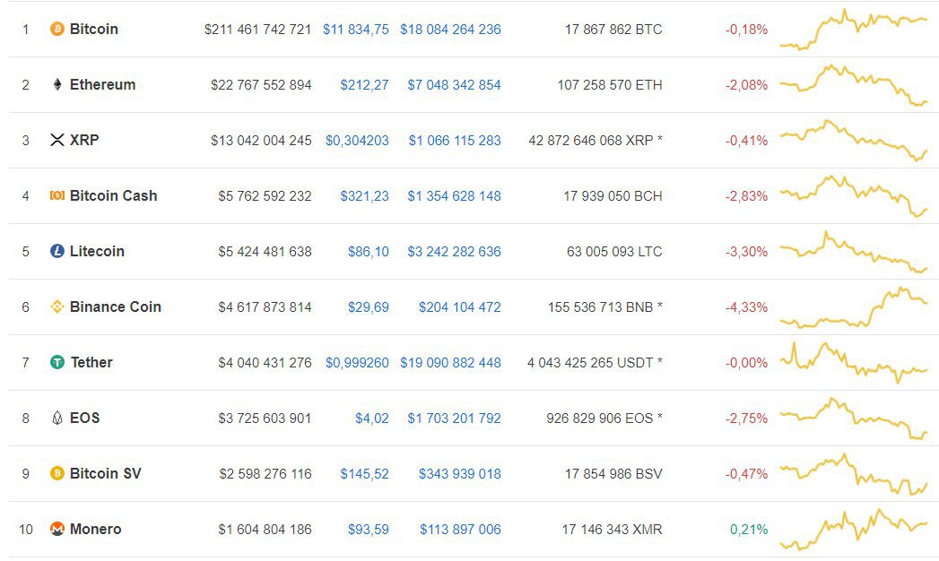 Так за сутки биткоин подешевел на 0,18% и торгуется на уровне $11 834.