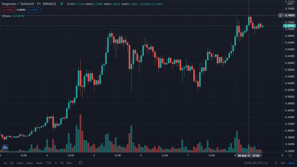 8 мая цена Dogecoin обновила исторический максимум на отметке $0,74.