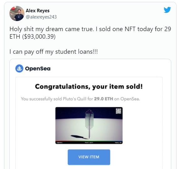 "Моя мечта сбылась! Сегодня я продал НФТ за 29 ETH (93 000$)
