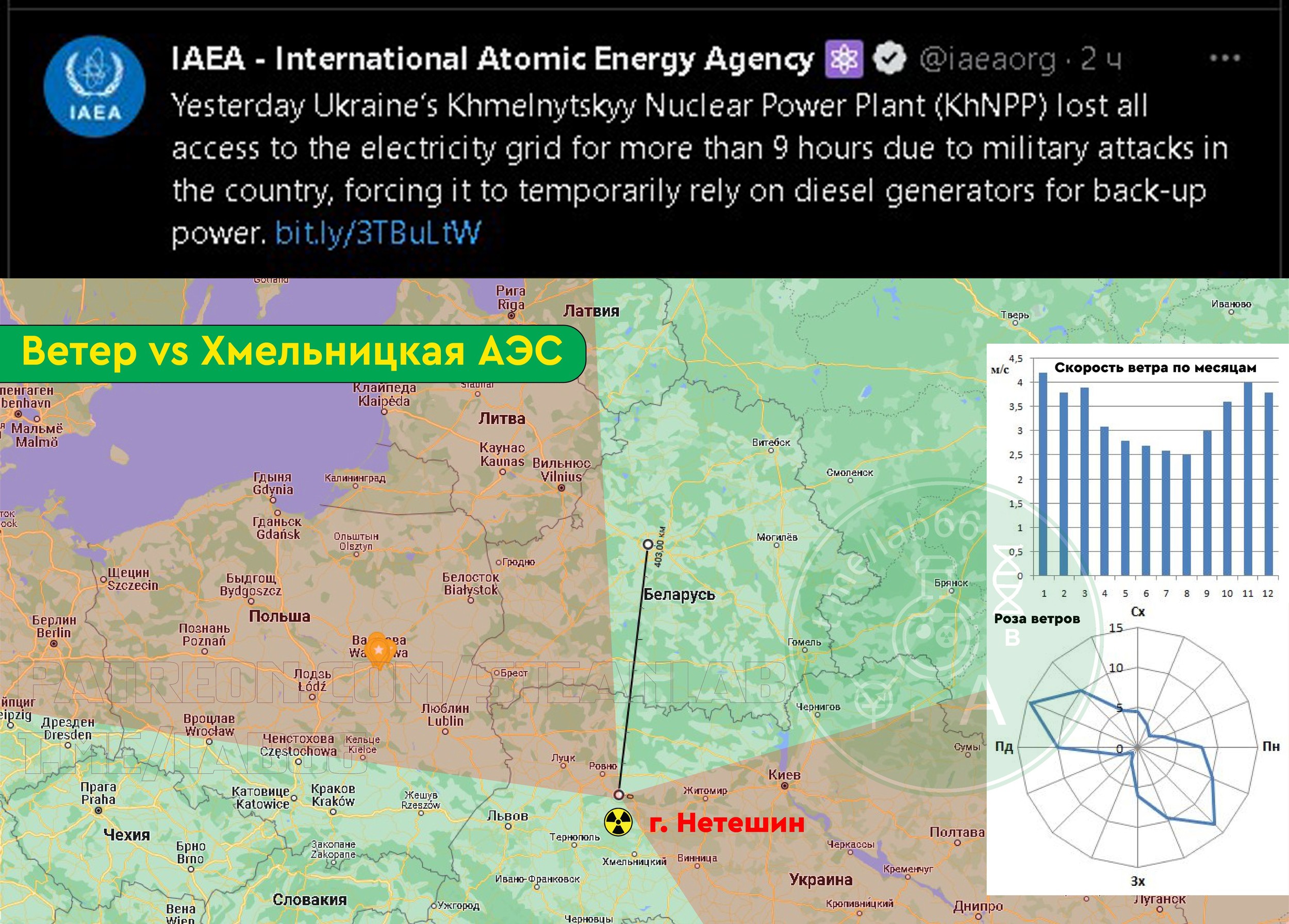МАГАТЕ в своем твиттере сообщило, что вчера Хмельницкая АЭС останавливала два свои реактора из-за потери связи с энергосистемой Украины (см. Update 127). Из-за обстрелов и разрушения электросетей станция 9 часов работала на дизель-генераторах. Напомню что ХАЭС (как впрочем и РАЭС) - это совсем рядом с Беларусью и розы ветров там весьма для беларусов неприятные.