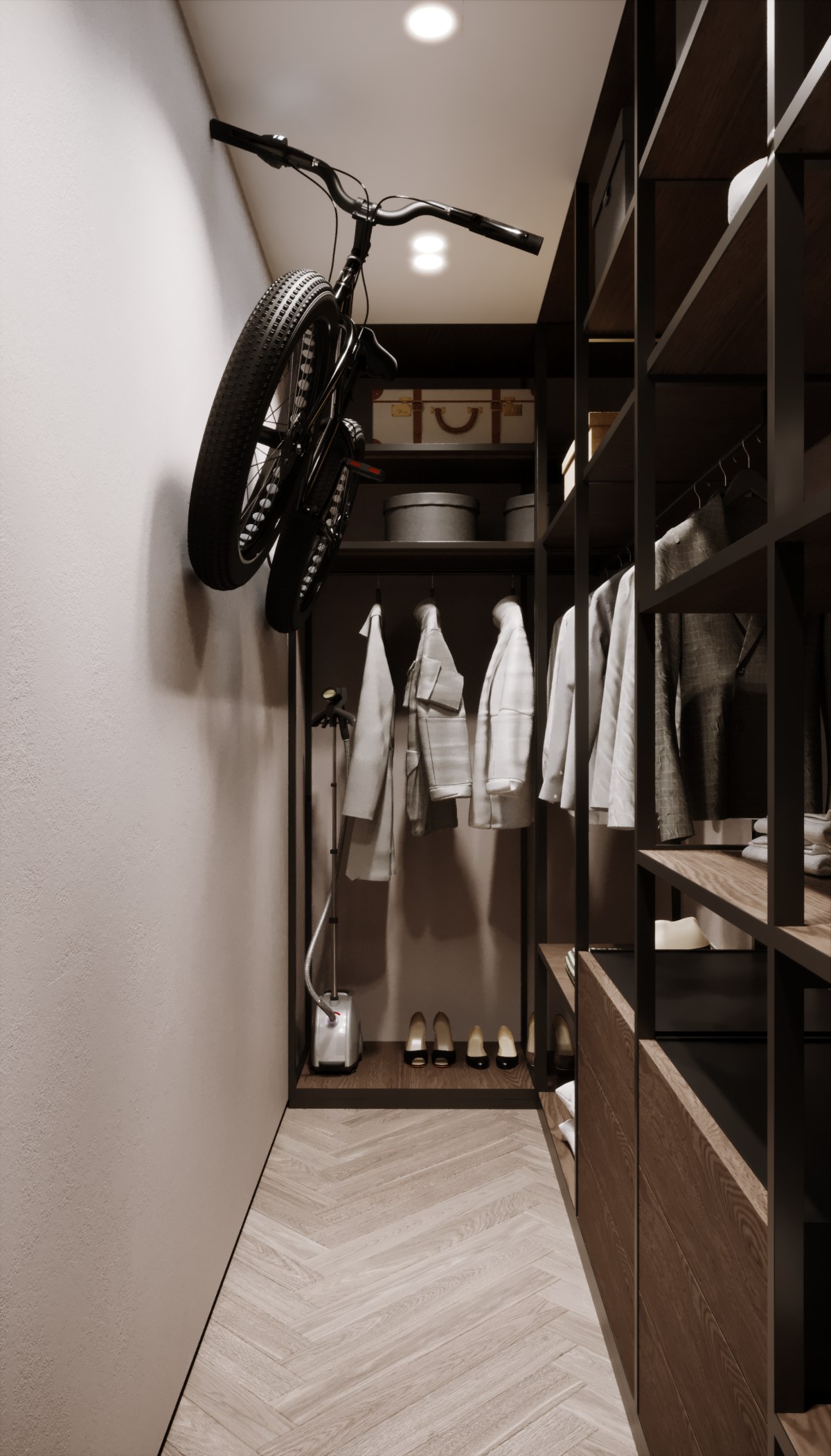 - Отпариватель как вы просили помещается. Глубокая открытая зона хранения полноценная буквой Г, комфортный проход. Все учли?