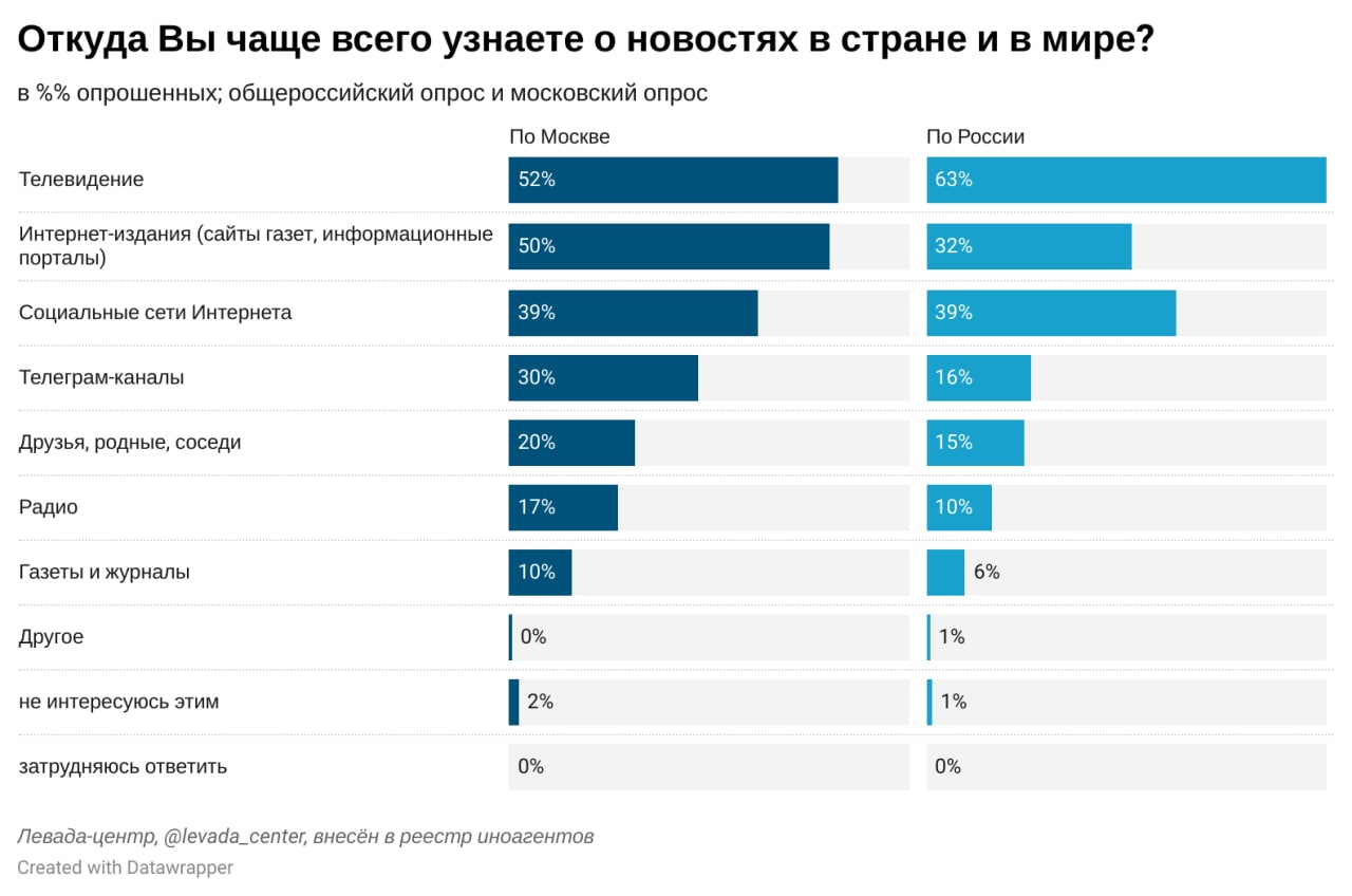 Левада-Центр провел исследование отношения россиян к принятому закону о «фейках» в СМИ, доверии информации в контексте конфликта с Украиной. Формулировки исследования были составлены совместно с интернет-изданием «Спектр». Большинство россиян поддерживает принятие закона об уголовной ответственности за распространение «фейков» (79%), а государственные СМИ остаются источником информации с наибольшим кредитом доверия. В то же время в полной мере государственным источникам информации доверяет 31% опрошенных. Уровень доверия отличается в зависимости от возраста и политических взглядов.